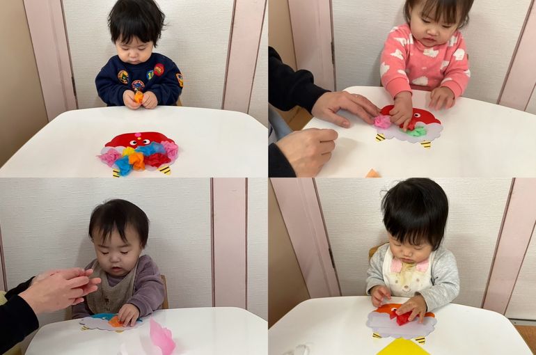 初めて花紙に触れた子どもも多く、床にひらひらと落ちる様子を観察したり、ティッシュの感触に似ていたのか鼻を拭いたりして感触を楽しんでいて、かわいらしい一面も見られました♡