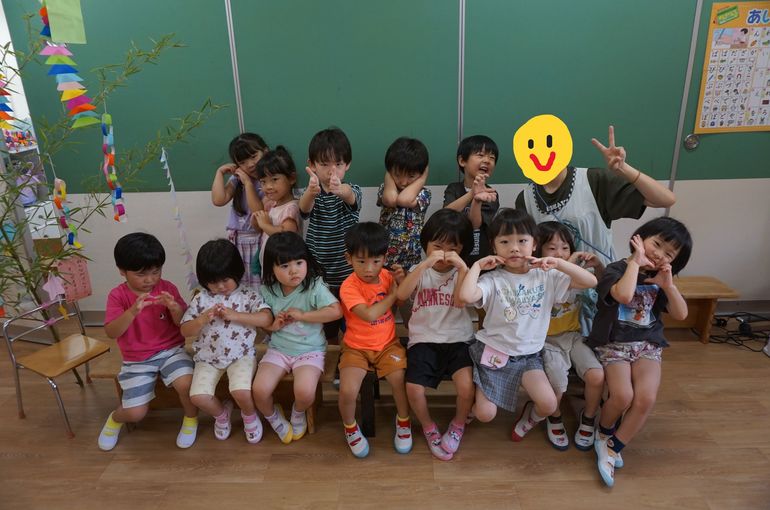 七夕の織姫と彦星のお話を見た後だったので、子どもたちのポーズにハートが多いような。。。(笑)