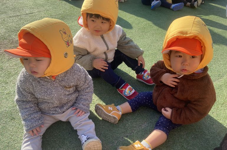 翌日、園では避難訓練を行い、にじぐみの子どもたちも防災頭巾をかぶって参加をしました。