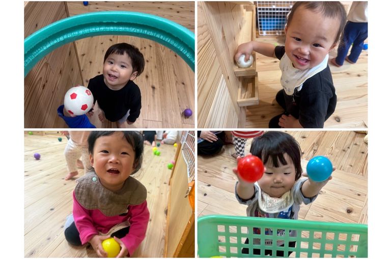 こちらはお部屋でボール遊びをした時の様子です🥎カラフルなボールがたくさん出てくると、両手にいっぱいボールを抱えています💚