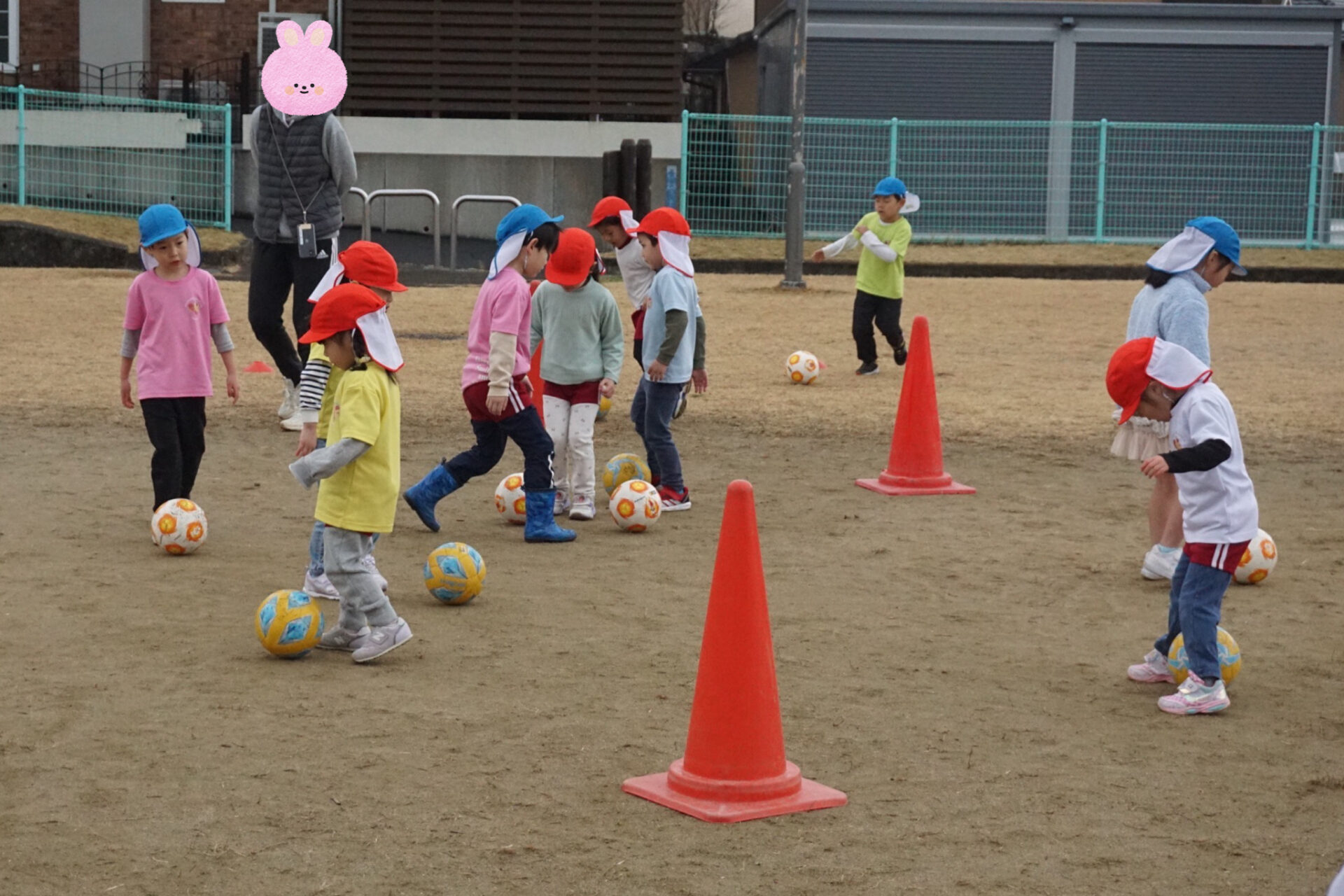 ドリブルも教えてもらいました!『アリさんドリブル』(ちょっとずつボールを蹴る)をしながら、お友だちやコーンにぶつからないように進みます😊