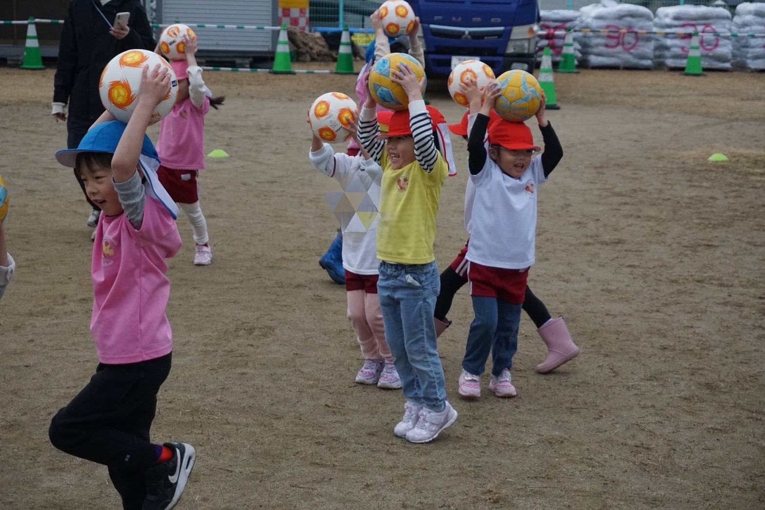 ボールを頭の上に持ち上げての移動もしました。子どもたち、とっても楽しそうです♪