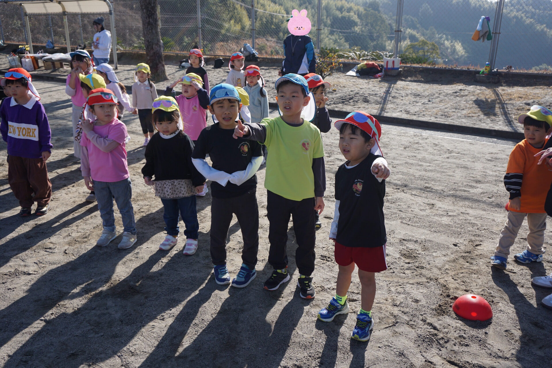 サングラスを頭に装着して、「スタート~♪」の合図とともに、逃げている保護者をニコニコしながら捕まえに行っていました!!
