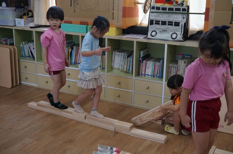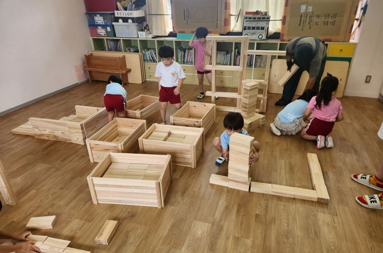 お部屋にあるものよりも大きな積み木で、子どもたちは見ただけで