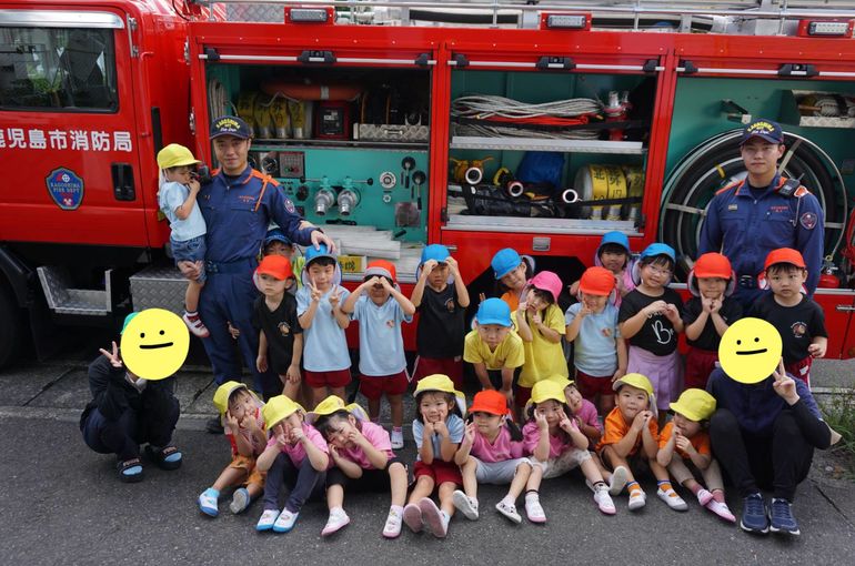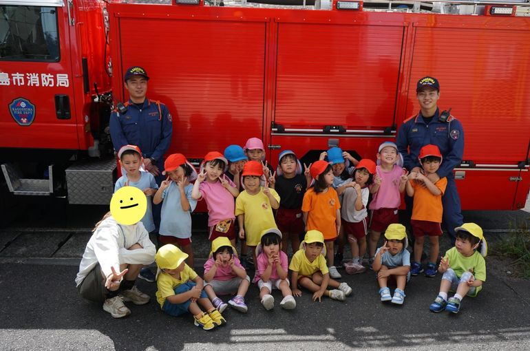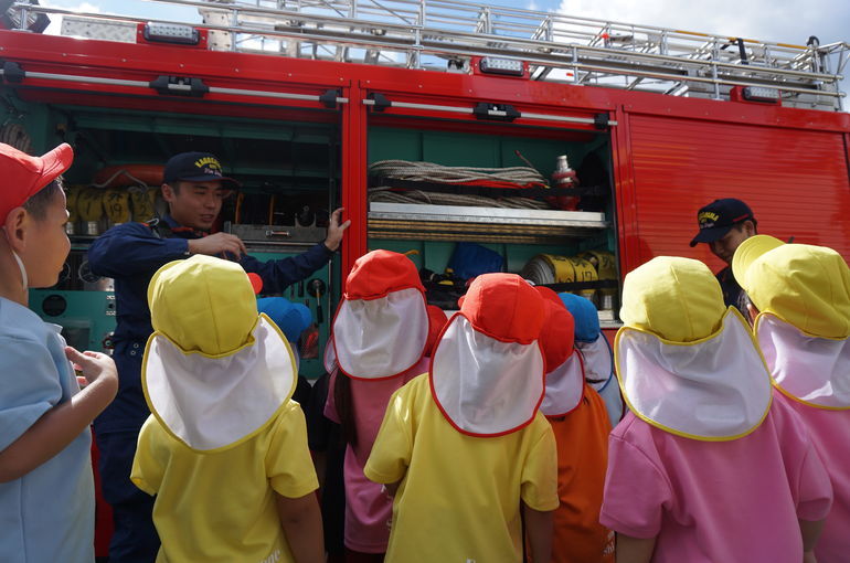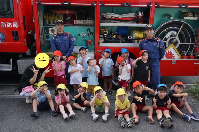 なかには「これは何に使うの?」「お水入ってる?」などと、たくさん質問しているお友だちもいて、それに対して優しく教えてくれる消防士さん達でした😇