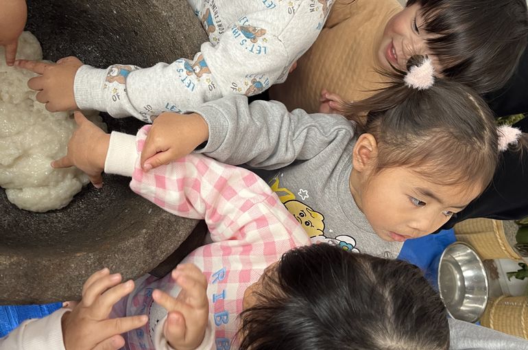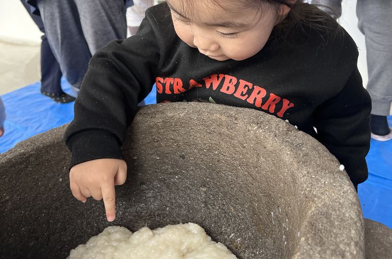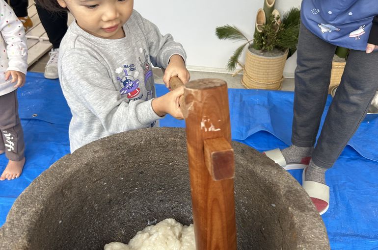 てんしぐみさんもお餅つき会に参加しました👏みんな嬉しそうに触ったり、ぺったんぺったんお餅をついて喜んでしました😌